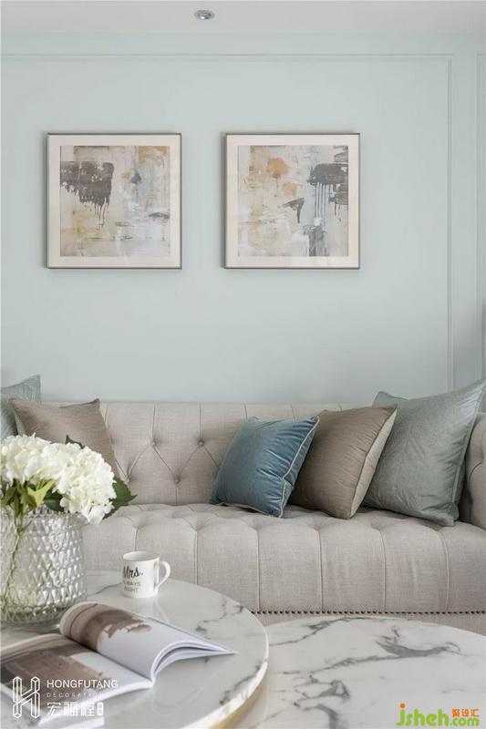 整個空間以清爽明朗為主,選用淺松石色作為墻面,海港藍(lán)運用在沙發(fā)和窗簾上,同色系冷調(diào)搭配,空間更加平和,也符合業(yè)主的需求;沙發(fā)、地毯選用淺色系,茶幾為大理石材質(zhì),提高空間時尚度;由于整個空間顏色都顯得較“輕”,所以電視柜為深棕色,突顯空間質(zhì)感,輕重劃分和諧。