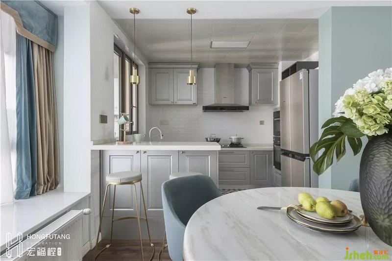 廚房原始較為封閉,與業(yè)主溝通后將廚房做成開放式,將廚房空間延展開,增添了廚房的光線,同時(shí)在左側(cè)增設(shè)1200*550的吧臺(tái),滿足了業(yè)主的需求,吧臺(tái)的運(yùn)用也提供了更多的食材操作空間,增加家人之間的情感交流。