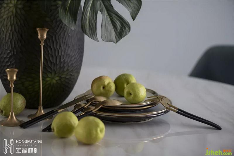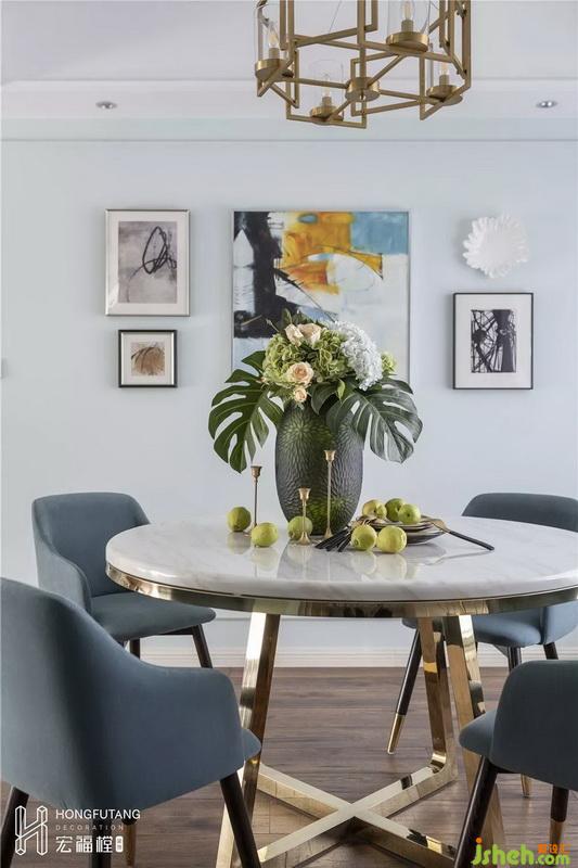 餐廳正對(duì)廚房,在一個(gè)過于方正的空間內(nèi),選用圓形餐桌可以柔化方正空間的硬朗棱角;餐桌椅材質(zhì)選用延續(xù)客廳家具風(fēng)格,蔚藍(lán)色餐椅作為深色出現(xiàn),餐廳空間顏色深淺搭配,突出空間重心。