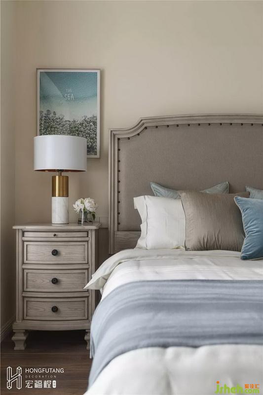 主臥空間選用米黃色墻面,色調(diào)溫馨自然,符合人體視覺感知;家具選用木紋質(zhì)感,提升空間品質(zhì);選用霧霾藍(lán)作為軟裝色系出現(xiàn),臥室空間氛圍沉靜、溫柔。