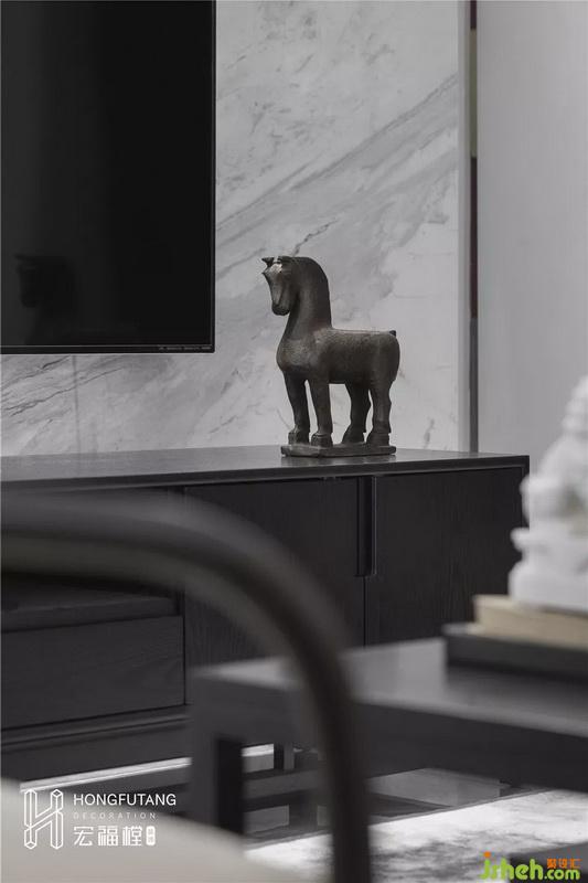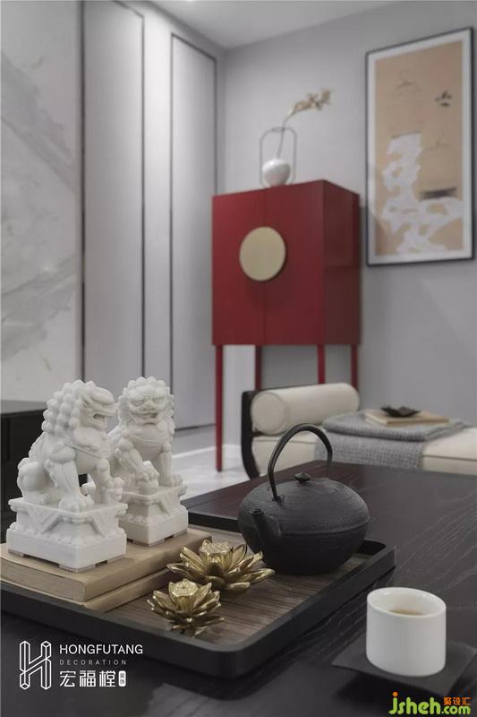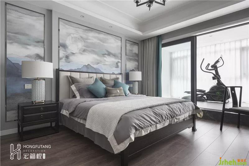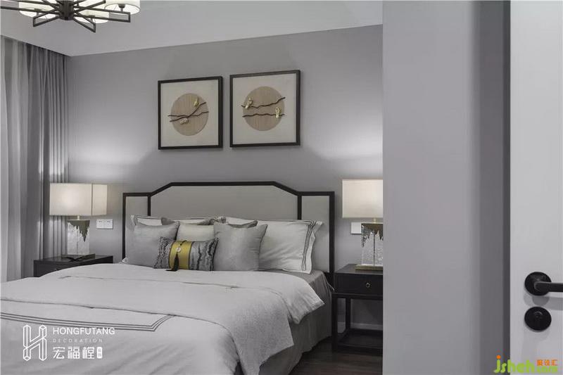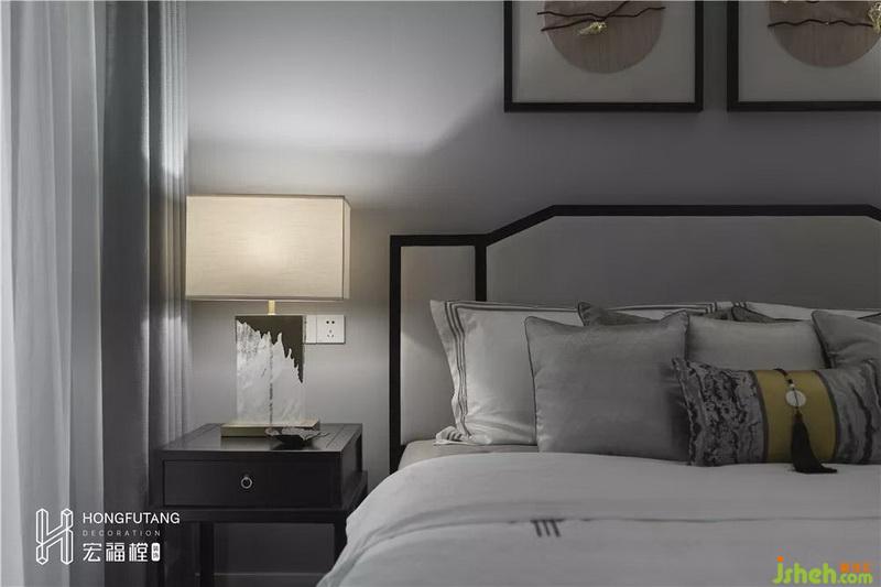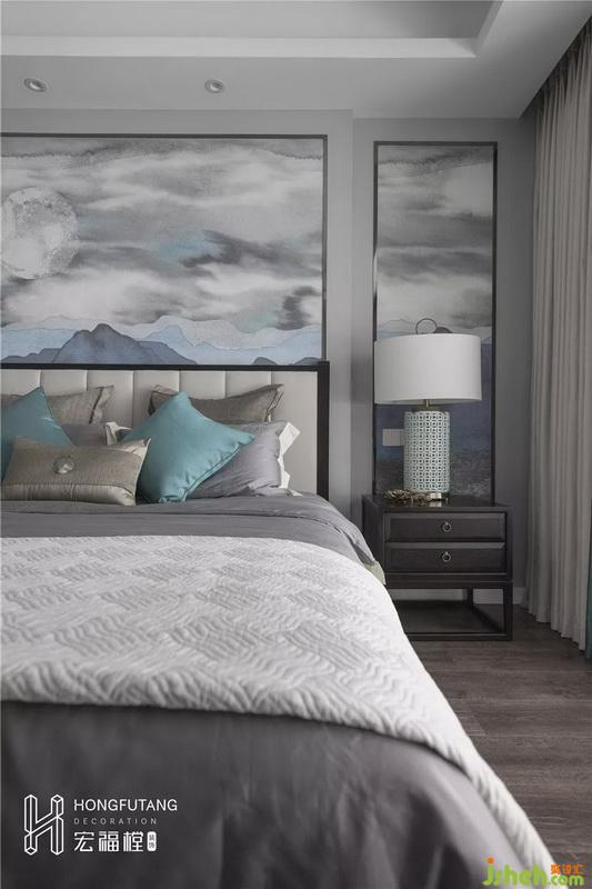 主臥吊頂設計使得視覺空間更加開闊,延續(xù)高級灰主色調(diào),選用天水碧和沙青兩種中式色彩作為軟裝調(diào)和單色帶來的孤獨感;家具擺件線條明朗紋理清晰,體現(xiàn)中式風格的內(nèi)斂、莊嚴、優(yōu)雅、質(zhì)樸,直線裝飾線條體現(xiàn)現(xiàn)代人追求簡單生活的居住氛圍,更迎合了現(xiàn)代氣息,臥室空間更加實用,富有現(xiàn)代色彩;床頭背景采用絲綢定制墻畫,比山水畫更加溫柔,提高空間質(zhì)感。