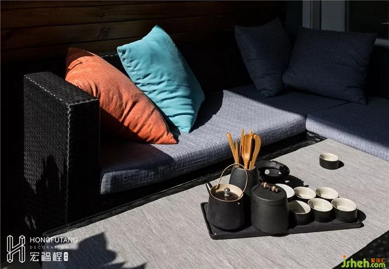 休閑陽臺(tái)室內(nèi)設(shè)計(jì)師選用L型戶外編織沙發(fā),依靠陽臺(tái)輪廓擺放,搭配矩形小茶幾,可作為一家喝茶休閑、待客的空間。