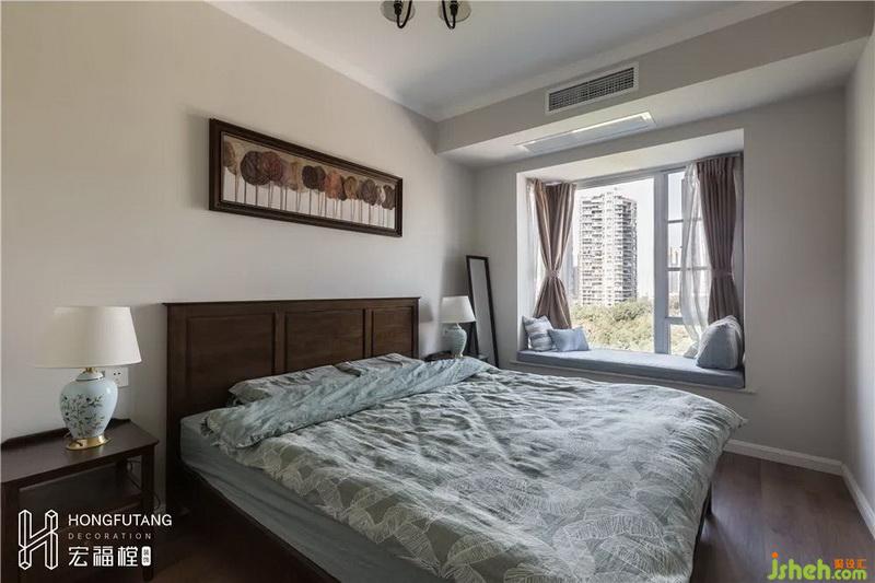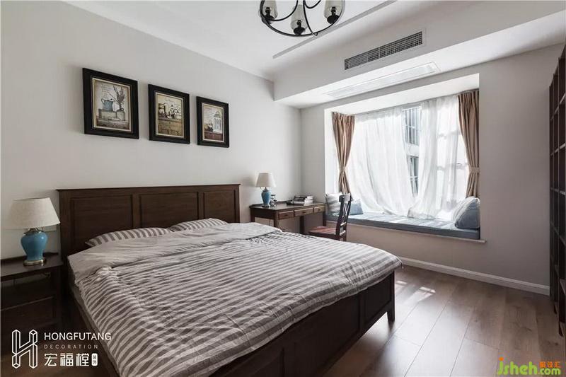 主臥采用白色墻壁搭配棕色家具,淡藍(lán)色作為軟裝調(diào)節(jié),空間冷靜穩(wěn)重,符合業(yè)主氣質(zhì)。床頭選用三幅壁畫壁畫,立體感強(qiáng),平衡空間重心。