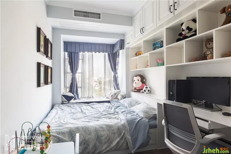 兒童房選用淡藍(lán)色為主色,家具采用榻榻米床、書柜、書桌一體式。