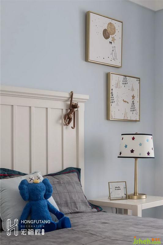兒童房選用淡藍色為主色,灰藍色窗簾與白色邊框交錯,增添空間層次;城堡墻紙符合小朋友的童心,將兒童房陽臺作為小朋友學習區(qū)和玩具收納區(qū)角,與休息區(qū)互相獨立,保證兩個區(qū)域的整潔和空間合理利用。