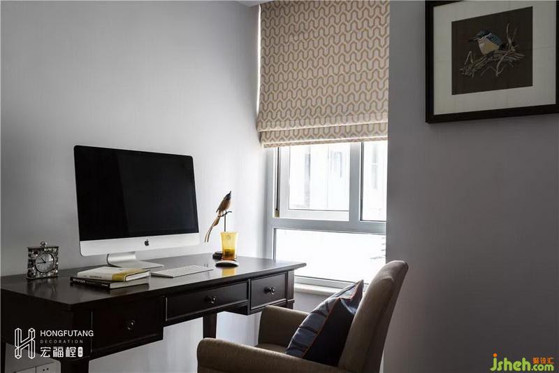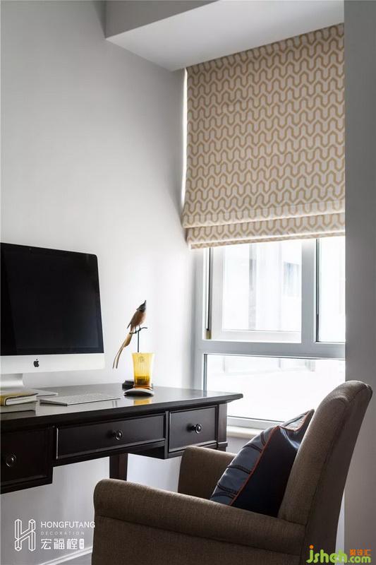 書桌靠近窗邊陳列,利于辦公采光。考慮到日后要將書房改造為兒童房使用,目前書房采用活動家具,便于移動更替。