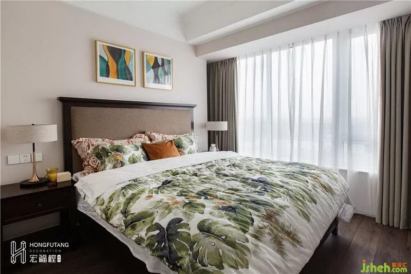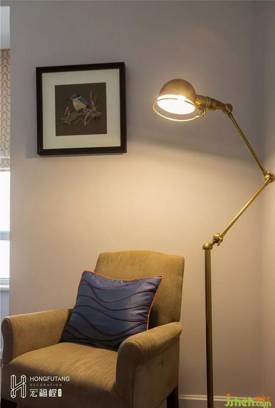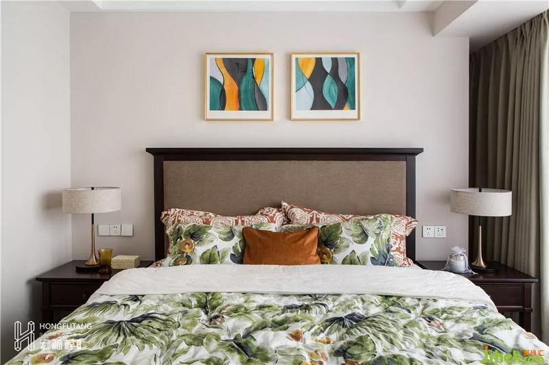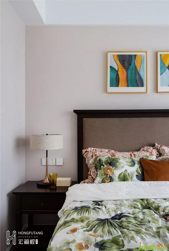 主臥選用典型美式搭配色彩米金咖作為主色,用綠色和橘色增添空間活力。這是源于臥室空間寧靜的環(huán)境氛圍,選用低明度色彩更利于臥室空間打造,用小范圍的亮色提亮部分空間明度,也不會顯得過于沉悶。