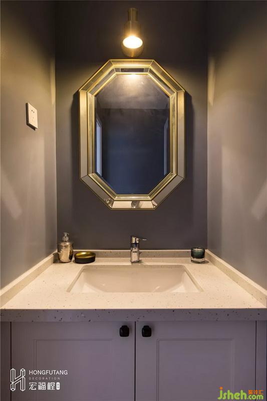 干區(qū)空間面積壓縮,所以在設(shè)計(jì)時(shí)以簡潔為主,不需要設(shè)立太多裝飾,帶有柜子的洗手臺就能解決大部分收納問題,也使得干區(qū)空間整潔有條理;選用六邊形鏡子,使得小空間更加靈動不壓抑。