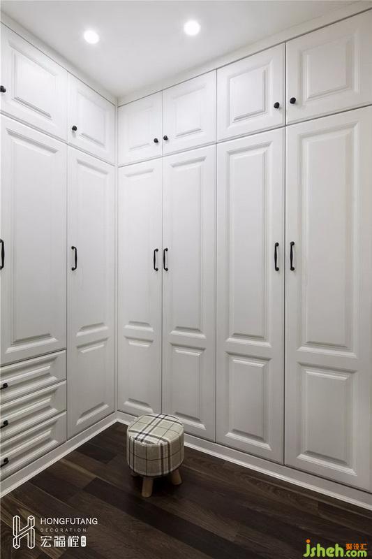考慮到主臥原始收納空間不足,將主衛(wèi)生間改造成衣帽間,面積由3.8㎡擴大到5.3㎡,可滿足業(yè)主日常收納需求;還將衣帽間的入口做成斜面,斜面的采用可以在增加衣帽間的面積的同時擴大臥室空間感。且斜面預留出的空間,還能增加一組斗柜,用作日常儲物使用。