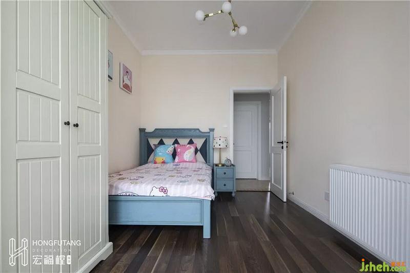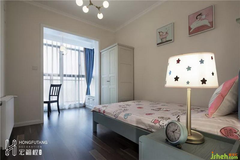 兒童房形狀偏長,門開在右側邊角,所以將床往左靠墻擺放,進門視線更開闊,選用粉藍粉紅滿足女兒的童話公主夢;選用活動家具,左側書桌,右側矮柜,動線更流暢,便于小朋友活動,視野更加開闊,也便于日后移動更替。