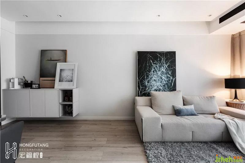 業(yè)主想有一個戶外活動空間,休閑陽臺依然保留。客廳空間有限,所以沒有采用茶幾,用地毯和沙發(fā)延伸客廳空間,地毯的使用使得冰冷的地板有了溫暖,可容納業(yè)主二人平時看電視,打游戲,在朋友來時,也可直接席地而坐,減少多余凳子對空間占用;電視墻選用白色墻壁搭配木色底板,本身整個客廳選用白色墻壁,顏色單薄,搭配木色包邊做成凹凸?fàn)?,使得空間層次感更強(qiáng);選用底臺設(shè)計,減少電視柜對空間的占用,視覺上空間更加干凈;沙發(fā)墻選用大篇幅的深藍(lán)色系畫作,統(tǒng)一空間色系,也避免了墻面的空白感.