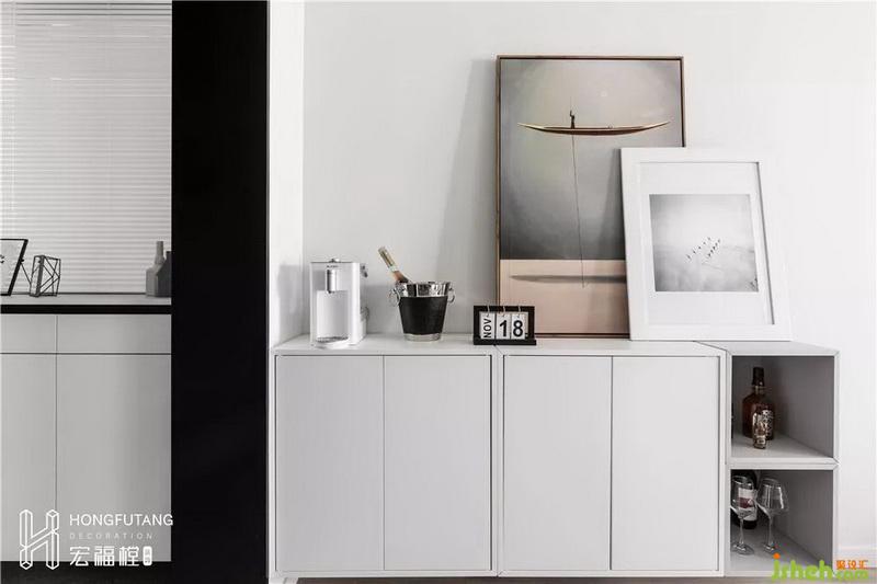 餐廳選用深灰家具搭配左側(cè)青灰墻面,灰色的運(yùn)用提高了餐廳空間質(zhì)感,現(xiàn)代感更加強(qiáng)烈。餐桌對(duì)面設(shè)計(jì)懸空掛式壁柜,上方可作為陳列區(qū)和小家電使用區(qū),左邊封閉柜子作為收納區(qū),右邊兩格作為酒具放置區(qū),采用這樣半封閉的樣式,避免了視覺(jué)呆板。