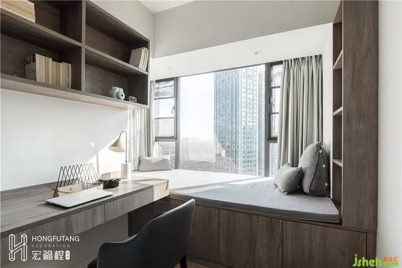 書(shū)房飄窗加寬,采用榻榻米形式,右側(cè)設(shè)立半封閉收納柜,可作為擺件的放置區(qū),榻榻米下方也有足夠的收納空間放置不常用物品,使得空間更加整潔;榻榻米的采用一是可作為業(yè)主偶爾工作放松區(qū)域、閱讀區(qū),二是可以用作客人留宿使用。