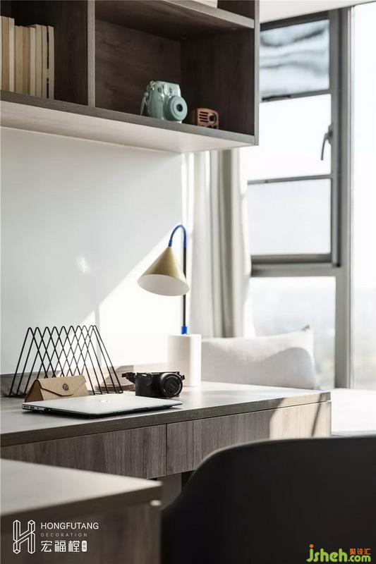 書(shū)桌和書(shū)籍收納區(qū)設(shè)立在榻榻米左側(cè),選用榻榻米同色系,保證空間色彩一致。