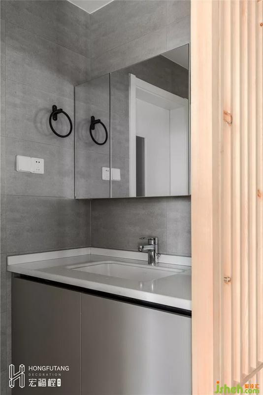 衛(wèi)生間采用淋浴區(qū)與洗手臺(tái)和坐便器完全分離,自成一個(gè)區(qū)域,保證隱蔽性和隔音效果,這樣使得一個(gè)衛(wèi)生間是能夠多個(gè)人同時(shí)使用,干濕分離最為理想的狀態(tài);拆除洗手臺(tái)旁的墻體,選用木制格柵做隔斷,增加空間通透感,木質(zhì)元素的運(yùn)用,打造溫馨自然的空間氛圍。