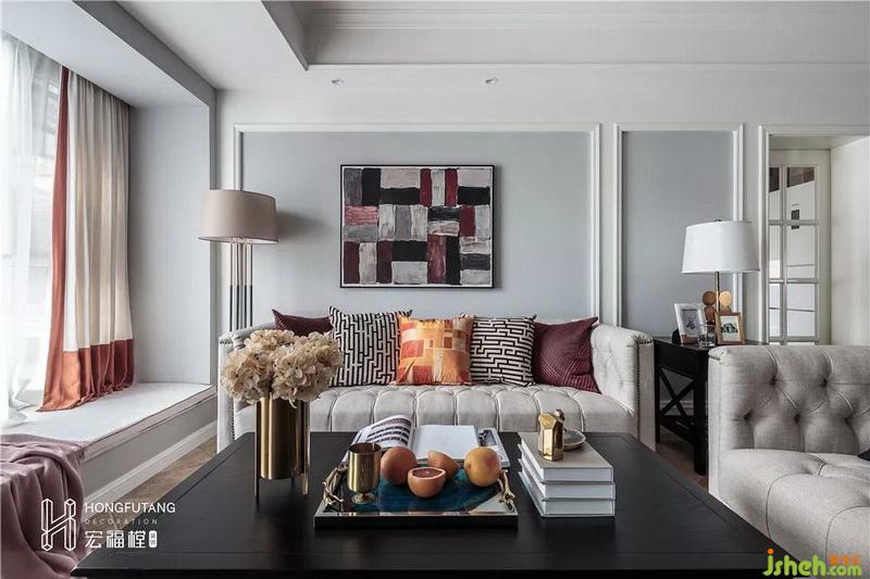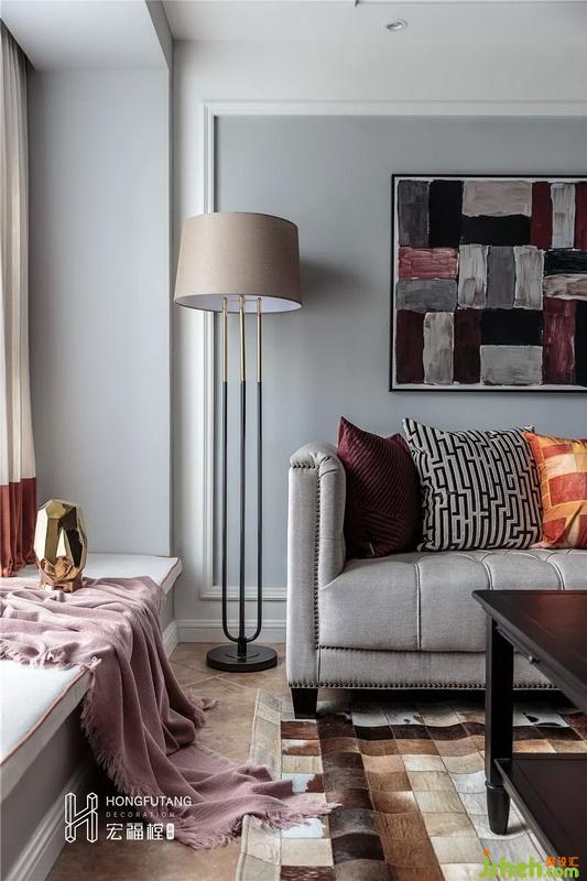 客廳面積有限,選用的家具相對占空間都不小,所以在客廳搭配上沒有選用過多的裝飾,而是采用色彩搭配來使得空間更加靈動(dòng);墻壁選用線條將灰白分界,使得整個(gè)墻面空間顯得更加立體,層次感更強(qiáng);壁畫、地毯、抱枕選用格子元素,能從視覺上飽滿單色的感官度,同時(shí)因格子本身的時(shí)尚氣質(zhì),提升整個(gè)家居品味,中和美式風(fēng)格的奢華,給人一種略帶俏皮的感覺。