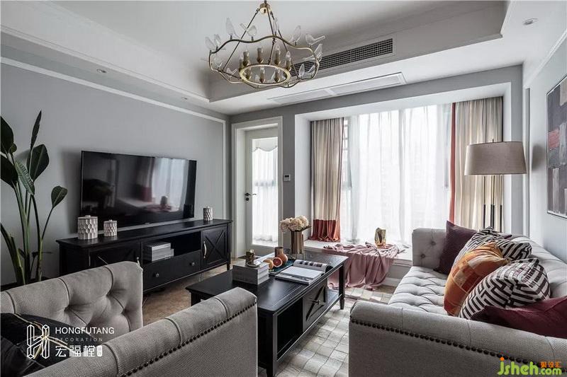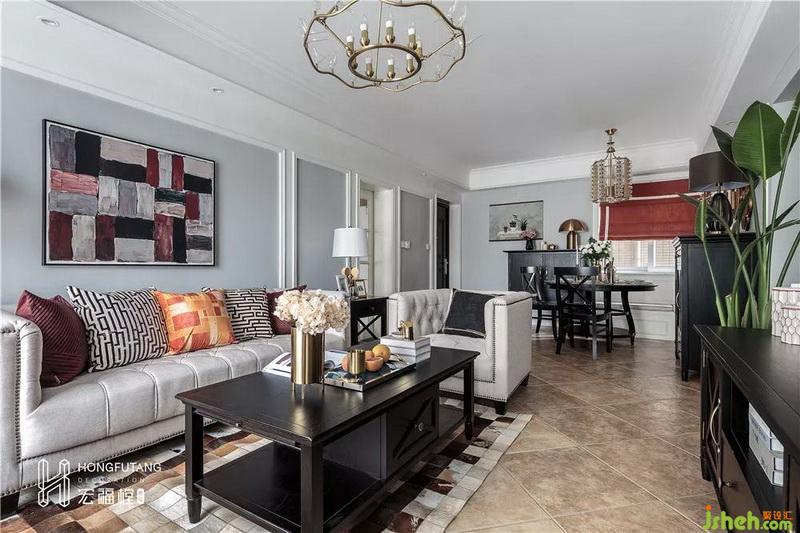 客廳裝修以灰黃搭配,美式風(fēng)格的典型代表,選用黑色家具穩(wěn)住空間顏色,軟裝采用紅、橙、棕色來搭配客廳空間,暖色系的使用使得整個(gè)空間更加愉悅、溫暖。