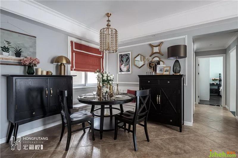餐廳面積較大,考慮到常駐人口少和使用頻率相對較低,設(shè)計(jì)公司沒有選用過大的餐桌椅。選取餐廳窗臺一角做成轉(zhuǎn)角卡座形式,卡座的設(shè)置可容納多人,這樣的設(shè)計(jì)能減少餐椅對空間的占用,臨窗而設(shè)用餐區(qū)光線更加明朗,提高用餐體驗(yàn);還有未使用的餐廳空間,擺放兩個(gè)斗柜,一是能作為空間陳設(shè)使用,二是增加收納空間,用作物品收到和擺件展示區(qū),合理利用餐廳空間,加之配以墻上裝飾,將餐廳打造成用餐、美學(xué)展示集合區(qū),選用紅色窗簾作為整個(gè)空間軟裝主色,活躍空間,別有美式風(fēng)情。