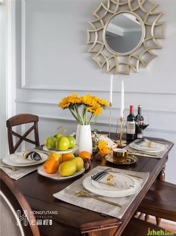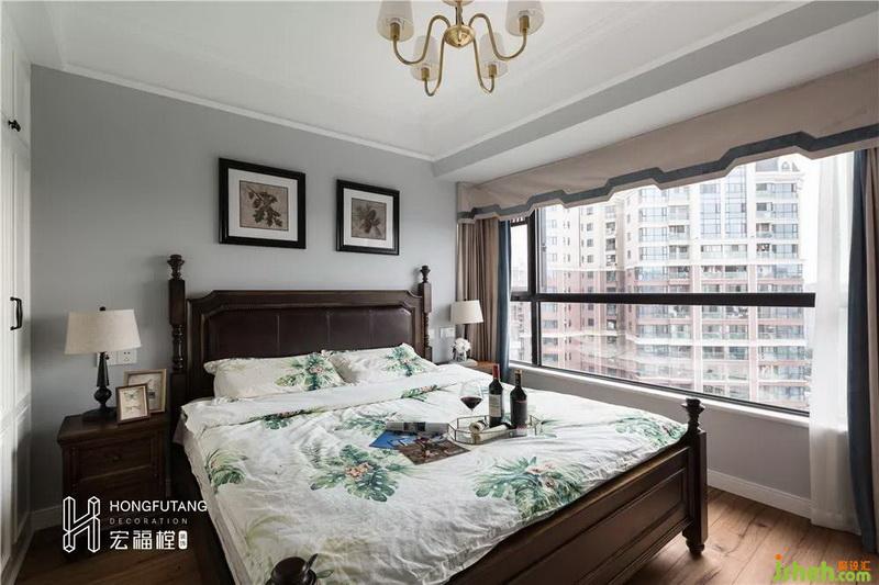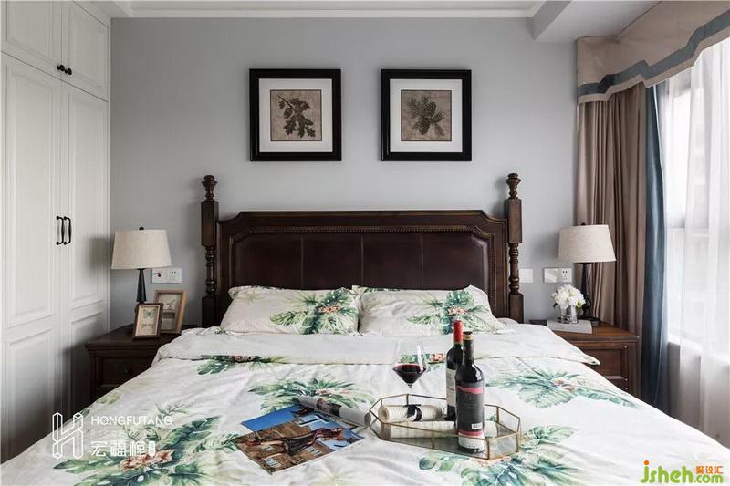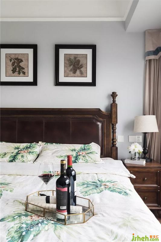 選用硬挺的皮質(zhì)床頭,皮質(zhì)床頭符合人體舒適感知度,又不會(huì)在視覺上顯得過于松散,契合美式風(fēng)格的優(yōu)雅;選用兩幅深色系掛畫豐富床頭上方空白墻壁,與整個(gè)房間色調(diào)一致;在衣柜顏色選用上,為避免整個(gè)臥室空間氛圍太過壓抑,選用白色衣柜配合深色家具搭配。