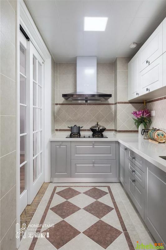 入戶墻面后退預(yù)留出鞋柜位置后,廚房空間有所減少,室內(nèi)設(shè)計(jì)師選用L型櫥柜,能夠滿足我們所需的儲(chǔ)物收納功能不受影響。