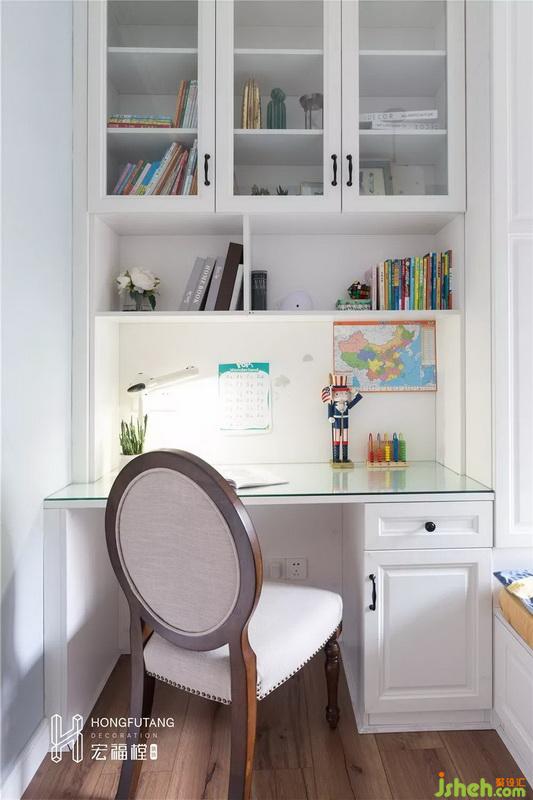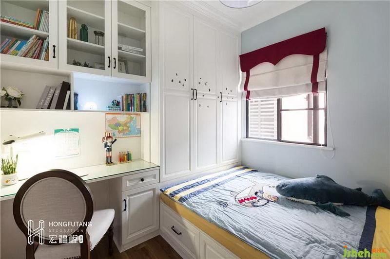 兒童房選用一體式家具,利用家具的自然線條,室內(nèi)設(shè)計(jì)師將每個(gè)功能區(qū)進(jìn)行明確的分隔。床的形式采用榻榻米樣式,一是榻榻米作為床使用可以節(jié)約空間,二是利用榻榻米靠墻空間和榻榻米下方作為收納區(qū),可收納不常用大件物品。左側(cè)上方做成書籍收納區(qū)和擺件展示區(qū),下方設(shè)立書桌,可滿足小朋友學(xué)習(xí)的需求。