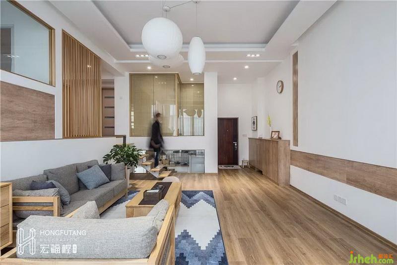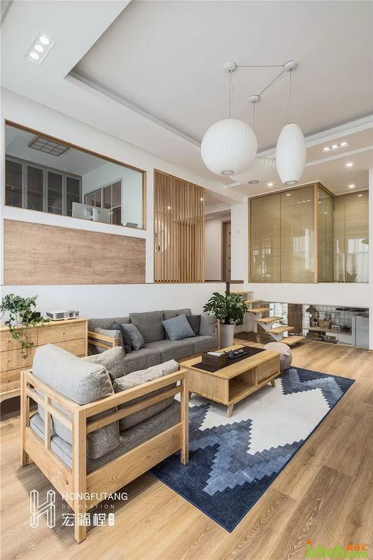 客廳用冷色調搭配原木色家具,沙發(fā)色彩是簡單的麻質灰,低純度的色系干凈利落。選擇漸變藍地毯彌補小面積茶幾帶來的視覺空白;摒棄傳統(tǒng)電視,采用投影,視覺上擴大感官,減少電視對空間的占用;客廳上方選用拇指柵欄隔離二樓公共區(qū)域,一是可以保障安全,避免從樓上摔下,二是木質柵欄相比其他隔斷更通透;木質樓梯清新簡潔,整個客廳沒有過多的裝飾,秉承了日式的簡約實用性。