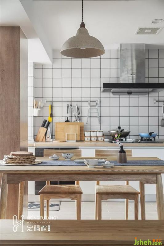 餐廳與廚房一體,打造開放式的烹飪就餐空間,明亮寬敞,開放式廚房更能增添家人間的情感聯(lián)絡;餐廳右側用柵欄分隔洗衣房和晾衣空間,可以遮擋一些生活用品,提高美觀度;因業(yè)主需求,隱藏多余的物品,櫥柜數(shù)量增加;餐椅選用橫凳搭配兩把椅子,橫凳沒有椅背使得視線更開闊,餐廳柱子的出現(xiàn)會影響橫凳的擺放,所以對面選用椅子,更好的調節(jié)空間。