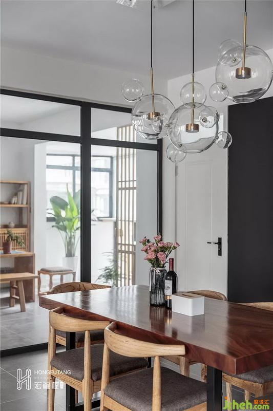 餐廳左側(cè)墻體拆除,選用玻璃隔斷將其與書房隔開,玻璃隔斷的采用使得餐廳采光更好,空間更加通透,右側(cè)采用軌道燈平衡餐廳燈光;座椅選用原木軟座使得用餐體驗感更加舒適;依靠廚房的墻面色彩選用黑色,是日式風(fēng)格向北歐風(fēng)格的過度,也將整個空間的重心突出,避免了大白墻的空白。