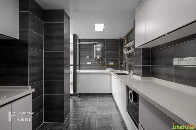 考慮到廚房本身屬于燥熱系,在廚房顏色選用上采用灰黑色墻面與白色櫥柜的結(jié)合,從視覺減少原木櫥柜的熱度;選擇低調(diào)沉穩(wěn)的冷灰色調(diào)打造整個廚房,不僅耐臟,而且有質(zhì)感,也能突出空間層次。