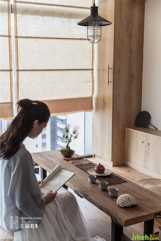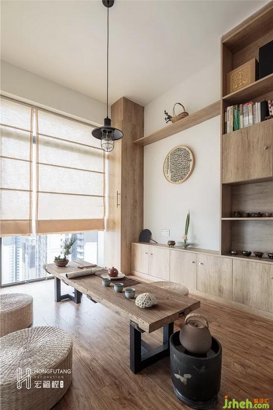 茶室原本為入戶陽臺位置,入戶陽臺空間過大,光用作入戶空間浪費,加之業(yè)主的茶藝愛好,所以將入戶陽臺分割6.9㎡出來改為獨立茶室。