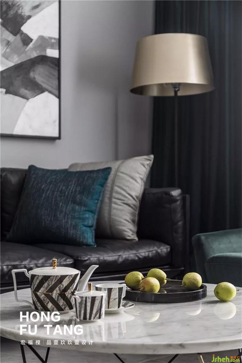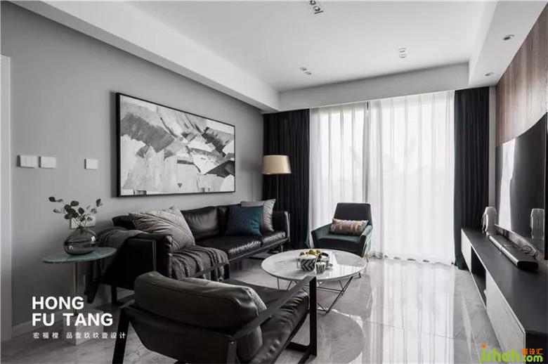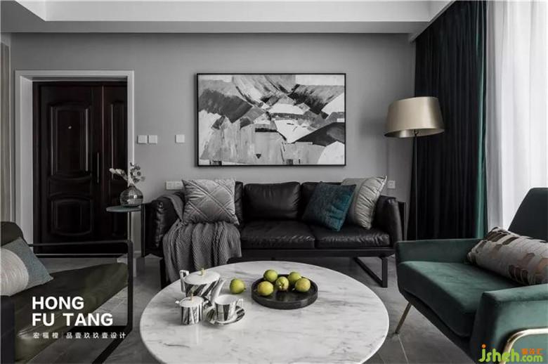 客廳窗簾和部分軟裝選擇墨綠色,作為家居中最親近自然的色彩,墨綠色來自茂密森林,不論外界如何炎熱,這里總是一片清涼,總是幽靜神秘。搭配空黑白灰,空間沉靜悠遠。