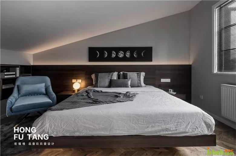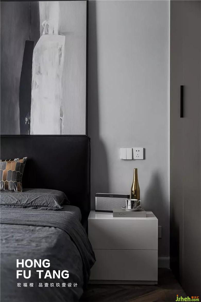 一層主臥風床頭采用黑色,床頭柜選擇白色,搭配灰色床單裝飾,延續(xù)整體黑白灰色調(diào),采用金屬色擺件,形成家居視覺的焦點,平衡深色系空間的冷清感。