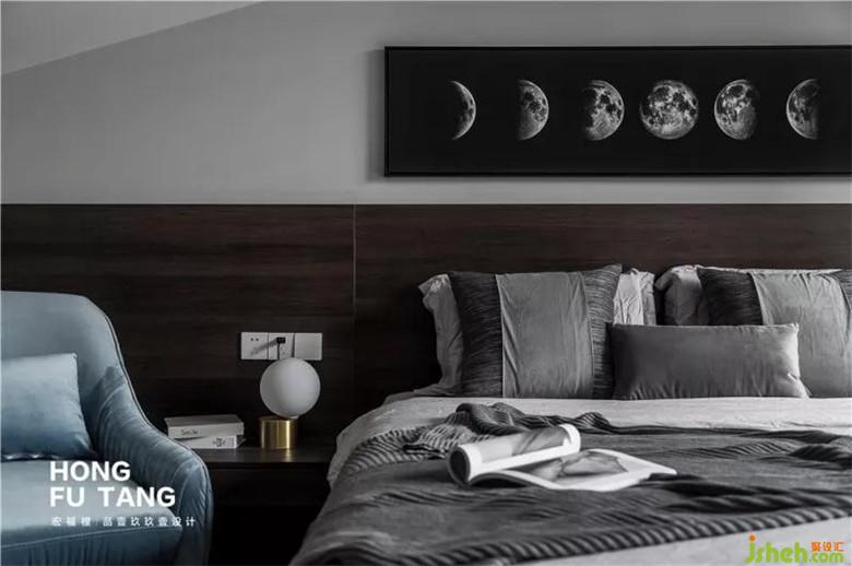 床頭空間低矮,為避免大片的留白,采用橫向月食圖,作為床頭壁畫,陰晴圓缺都是人生百態(tài)。