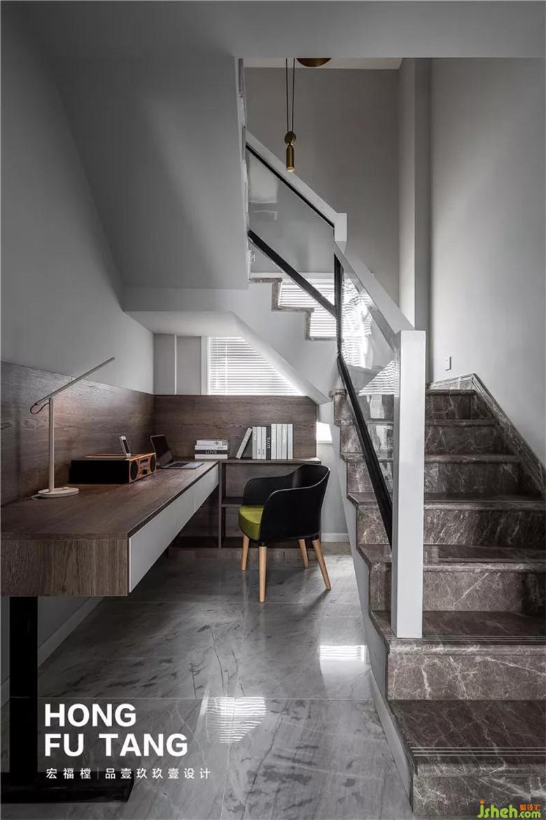 因為增添通往二層主臥的樓梯,利用樓梯間的區(qū)域做成工作區(qū),便于上下樓的同時,也有效地利用了空間;工作區(qū)桌子選擇儲物柜同色系,保持了整個空間色彩高度統(tǒng)一,利用原本右側(cè)窗戶,保證充足的光源。