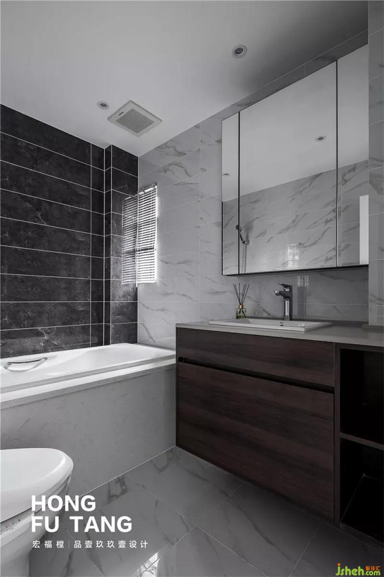 衛(wèi)生間色調(diào)整體色調(diào)一致,通過黑與白的搭配,帶來鮮明利落的視覺感受。