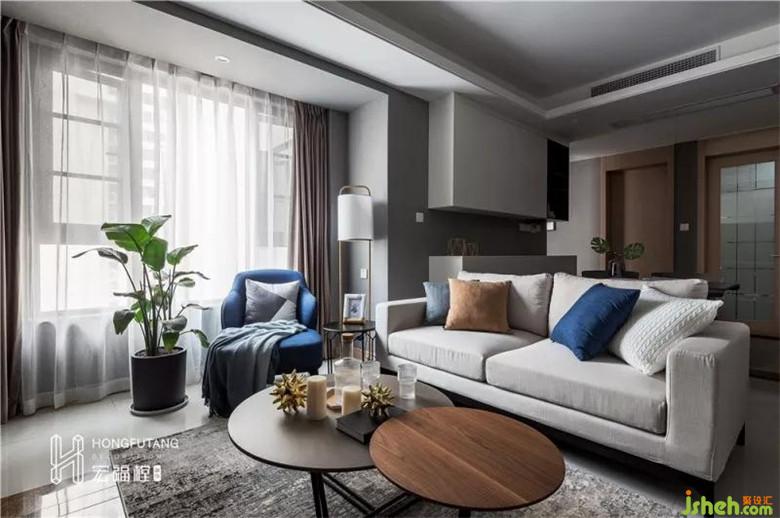 在色彩的選擇上,白色多人沙發(fā)調(diào)和客廳從容大氣的環(huán)境,藍(lán)色單人沙發(fā)作為空間點睛顏色,選用與門、墻角包邊相同色系的木色茶幾互相呼應(yīng),簡單隨和也不會冷清。