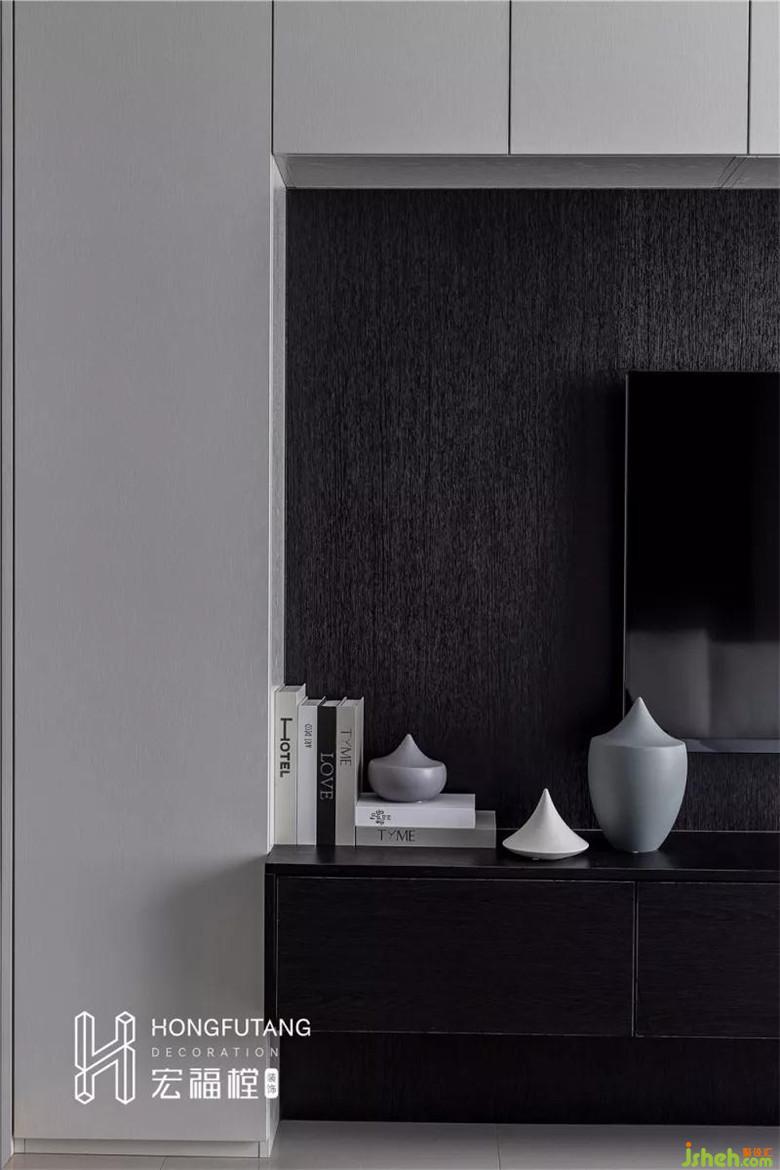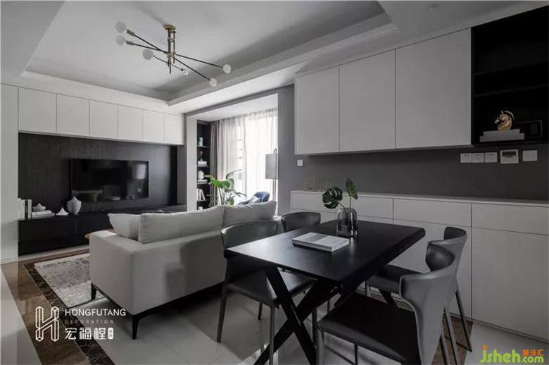 一是,設(shè)計師摒棄開發(fā)商原本用瓷磚做成的電視墻,選用黑色木柜與白色柜門結(jié)合,打造成入墻式的電視墻,把電視墻裝成收納柜,中間留出了電視機(jī)的孔位。黑色柜體紋理細(xì)膩,質(zhì)感強(qiáng)烈,與白色柜門搭配,形成明顯的視覺沖擊,整體顯得層次分明;收納柜的形式增加儲物空間,電視墻功能性增強(qiáng)??紤]到本身空間面積有限,在陽臺的處理上,設(shè)計師利用原始的隔墻嵌入部分,搭建收納展示區(qū)。