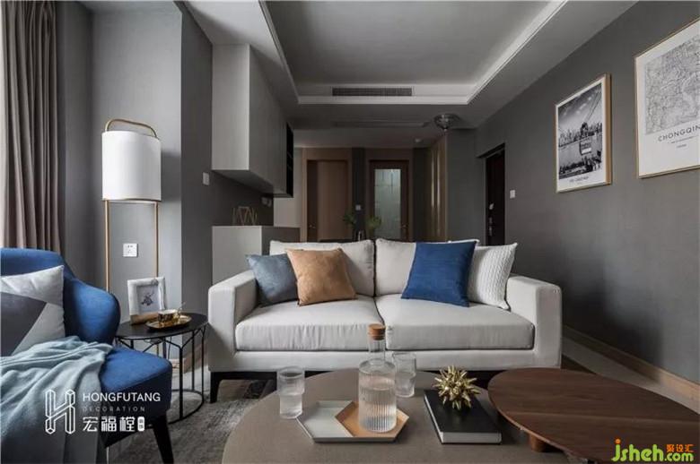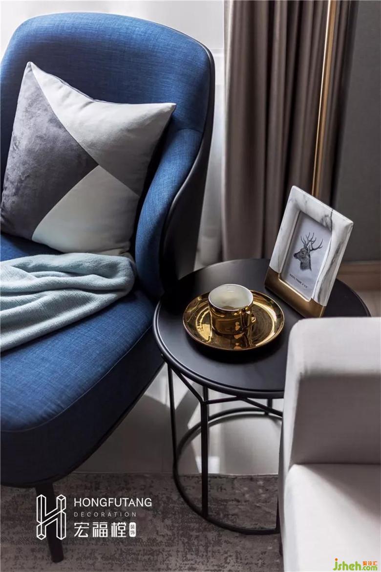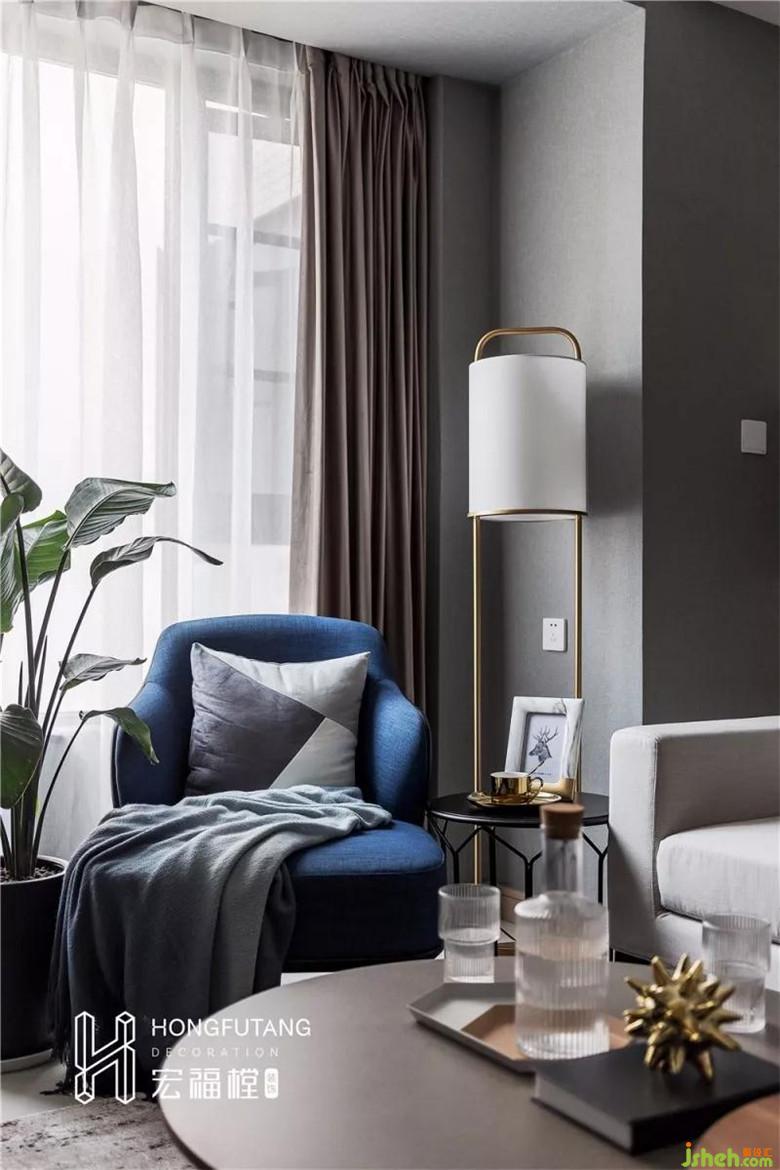 三是,使用深灰藍(lán)壁紙,避免的原始白色墻壁與黑白家具搭配視覺空洞,深灰藍(lán)壁紙的采用,使得空間層次感分明,與綠植、藍(lán)色沙發(fā)、藍(lán)色抱枕搭配,有種悠長而溫暖的韻味。