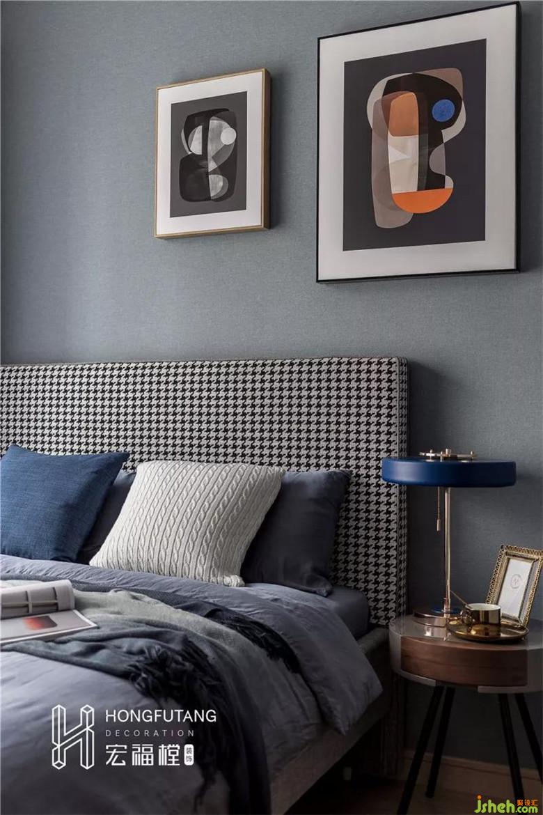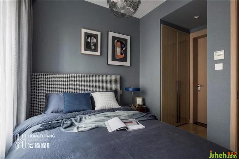 主臥延續(xù)整個空間的調(diào)性,在這里室內(nèi)設(shè)計師采用深灰藍(lán)壁紙,可以與客廳風(fēng)格統(tǒng)一,依靠原有的木色衣柜與門框,還能達(dá)到寧靜、溫暖的臥室氛圍。主臥面積有限,將床體一側(cè)靠飄窗,由此設(shè)計師特此選擇大小不一的兩幅畫掛置床頭墻面,平衡墻面的重心,使得空間更加靈動。