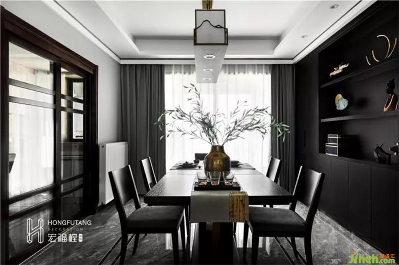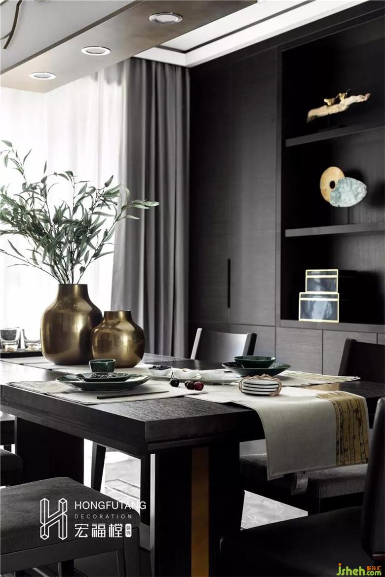 餐廳選用最簡(jiǎn)單的吊頂,黑色木質(zhì)包邊,搭配木質(zhì)布藝燈具,線條感強(qiáng)烈,符合中式方正中庸的氣質(zhì),也不失現(xiàn)代線條的簡(jiǎn)約;餐桌椅選擇傳統(tǒng)的實(shí)木,質(zhì)感溫和,方方正正的造型古樸親切,每一絲細(xì)節(jié)都透露著不卑不亢的中國古風(fēng);金屬飾品打破黑色家具的沉悶感,使得就餐空間更加人文化。