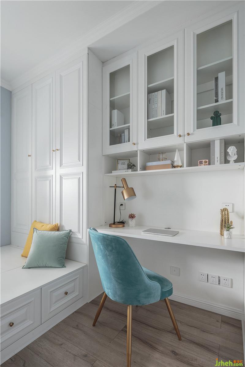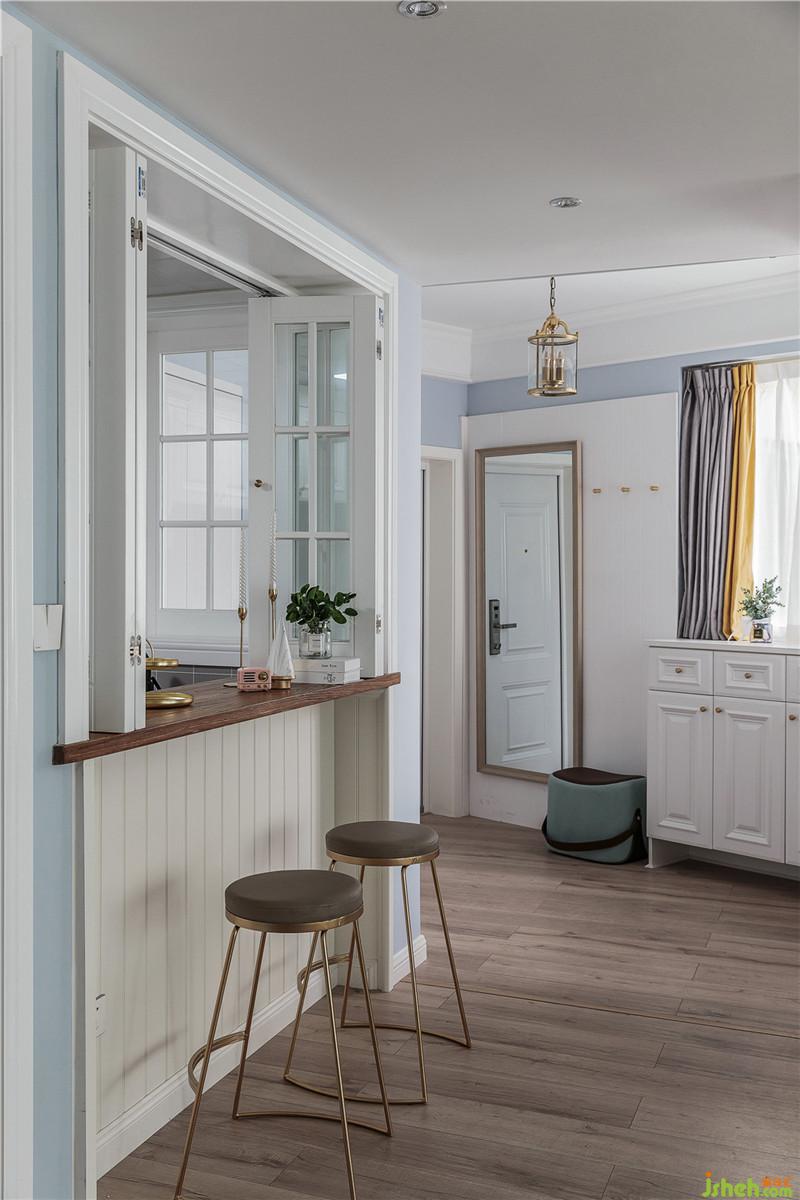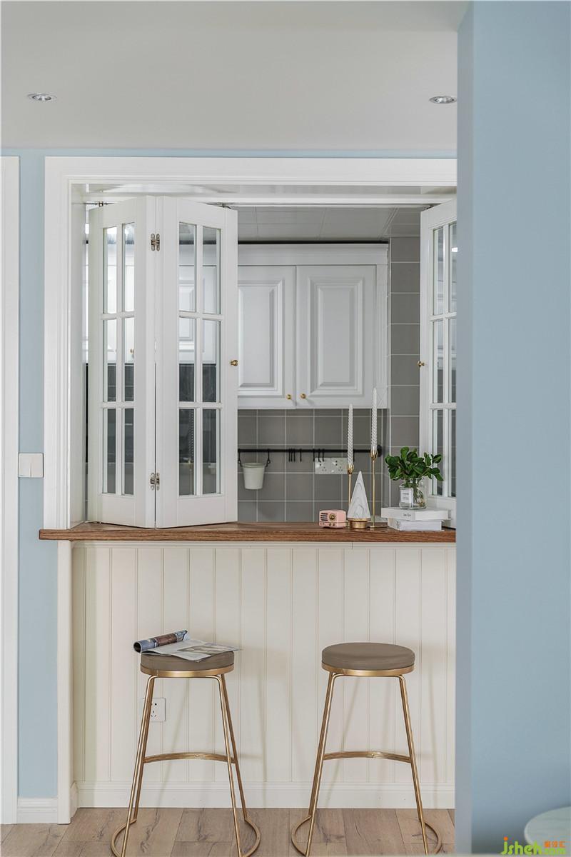 將廚房空間往外擴(kuò)大以后,加大了廚房使用空間,增設(shè)櫥柜操作臺(tái)面,滿足基本的廚房操作功能的同時(shí),也不會(huì)使得空間過(guò)于狹??;廚房門(mén)位置由側(cè)邊改至正對(duì)客廳窗戶,增加了廚房的自然采光,由客廳直接進(jìn)入縮短廚房路線;廚房門(mén)右側(cè)設(shè)立吧臺(tái),吧臺(tái)之上選用折疊窗。吧臺(tái)功能性很強(qiáng),一是可以作為西廚、甜點(diǎn)的操作區(qū),二是可以用作早餐,簡(jiǎn)餐的食用區(qū),三能作為菜品放置區(qū)或者女主人帶回的伴手禮展示區(qū)??蛷d過(guò)道過(guò)長(zhǎng),吧臺(tái)使得廚房和客廳有了好的聯(lián)系,將過(guò)道空間利用起來(lái),空間更為靈活,互動(dòng)性強(qiáng),增加了趣味性,也開(kāi)闊了廚房視野。室內(nèi)設(shè)計(jì)師