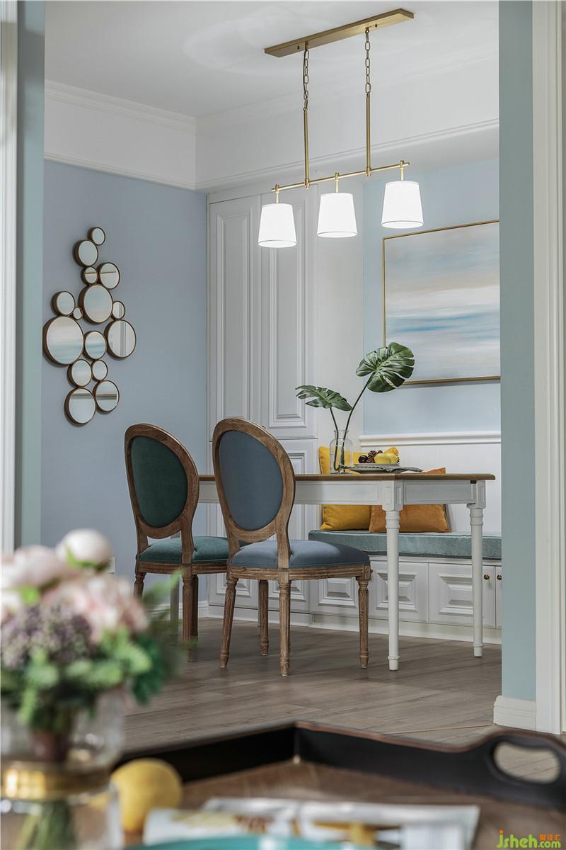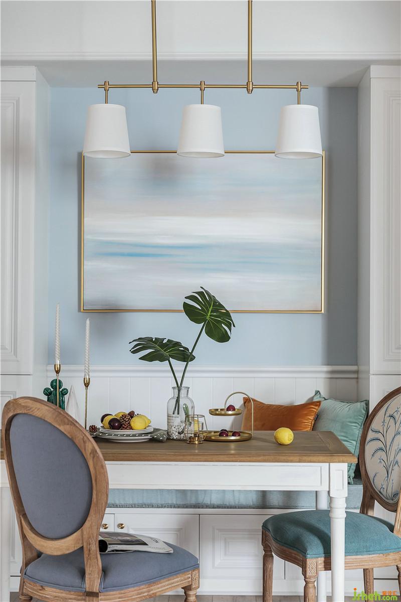 餐廳墻壁設(shè)立收納柜,采用中間卡座,左右收納的形式。增加收納空間的同時(shí),減少座椅對(duì)空間的占用,避免空間擁擠;為避免卡座上方墻壁的空白,選用與墻邊同色系的掛畫(huà),沒(méi)有大面積的留白,也使得和諧自然。這樣的餐廳設(shè)計(jì)和餐廳氛圍打造,一能包容日常就餐使用,二能將餐廳收納性加強(qiáng)。室內(nèi)設(shè)計(jì)師