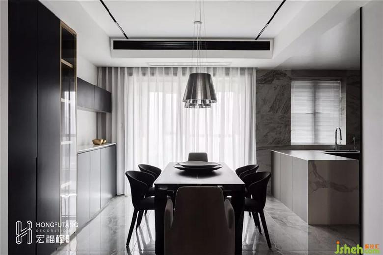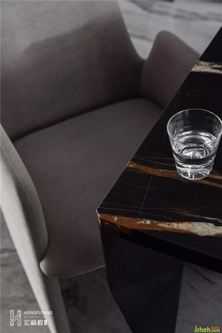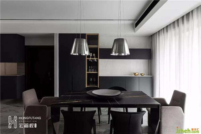 餐桌椅與餐柜之間用不同純度的灰色來區(qū)分間隔,與整體的色調(diào)形成了統(tǒng)一。空間要素通過細微處的元素變化按照同一性原則進行空間的塑造,體驗空間風格的圍繞感。不同體態(tài)的餐椅和材質(zhì),使得空間層次更加豐富,更具有儀式感。裝修設(shè)計