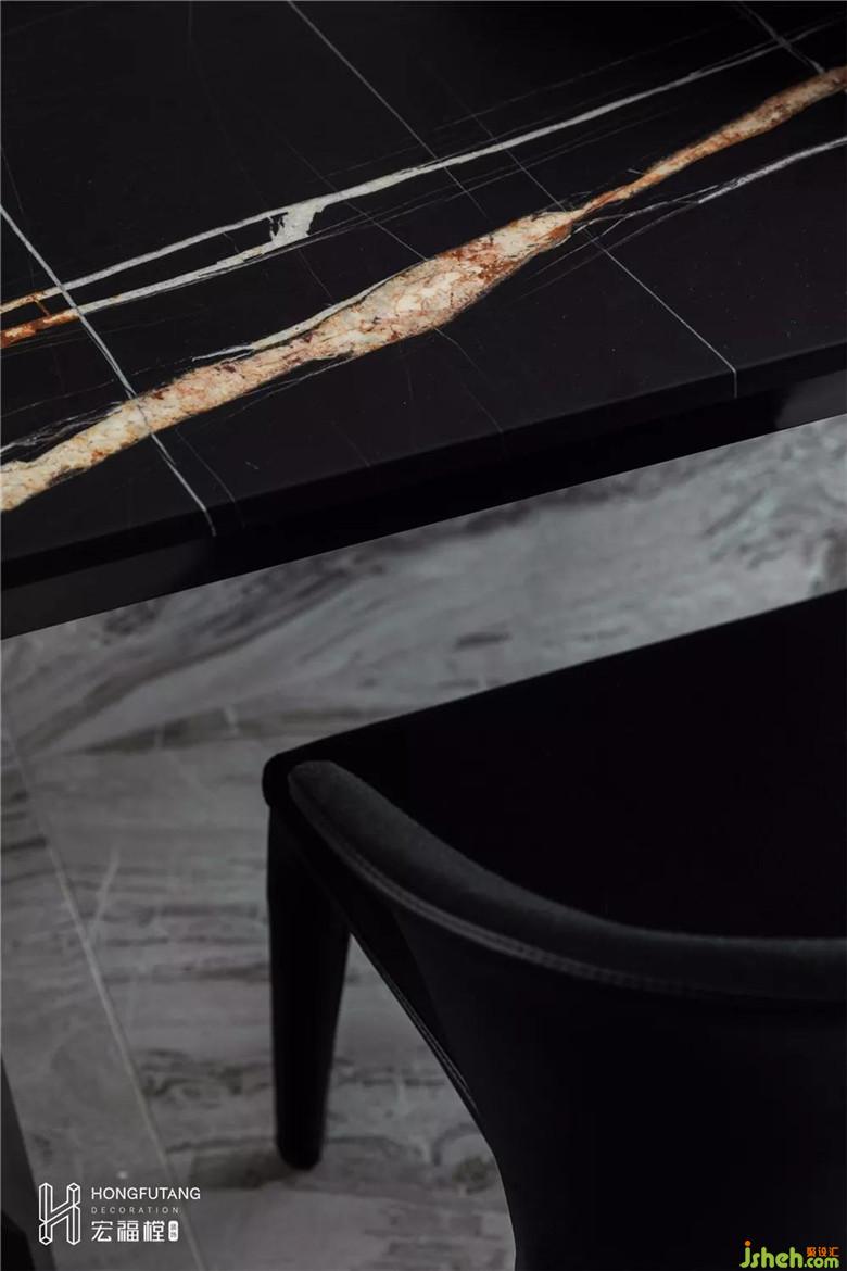 不規(guī)則紋理的餐桌與不同體態(tài)材質(zhì)的餐椅碰撞在一起,沒有了硬朗的感受,反而多了一份對于美食的期待。熱氣上桌,酒杯摩擦,餐具碰撞,都是在這里奏起了最溫暖的和旋,盛宴的期待。
