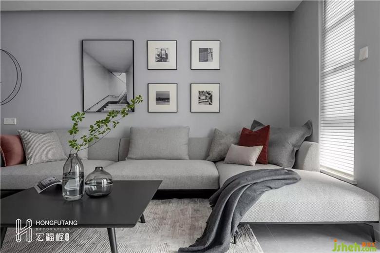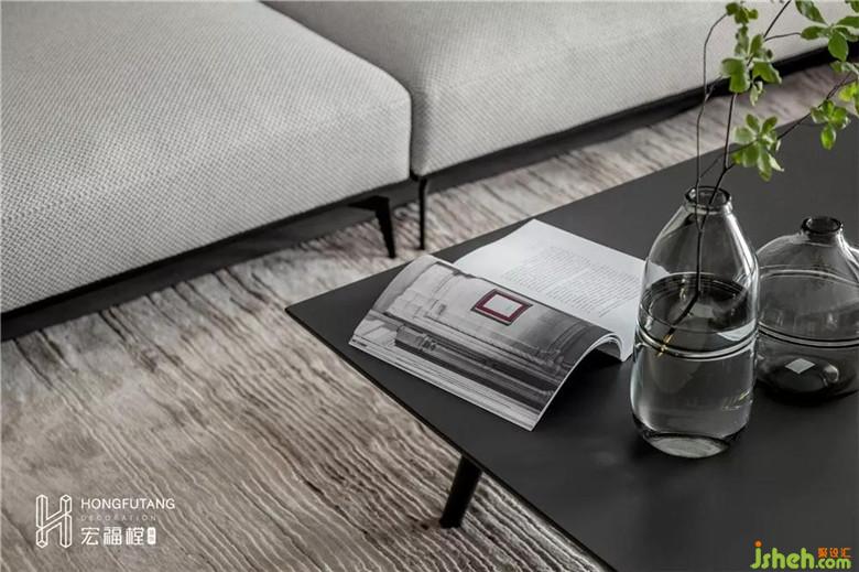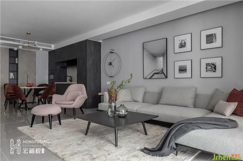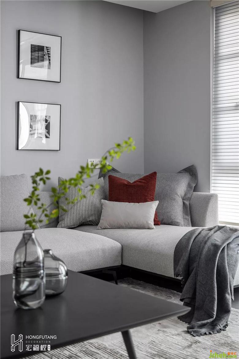 開(kāi)闊的客廳選用灰色為主色調(diào),不同純度的灰色在墻壁、地板、沙發(fā)、軟裝處使用,呈現(xiàn)空間的一體感,空間視覺(jué)通透明朗。