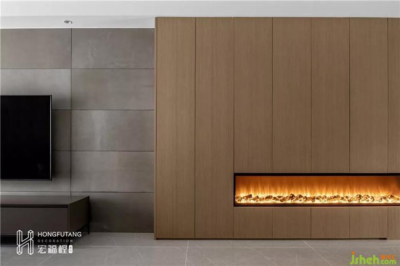 考慮到成都冬天的室溫,傳統(tǒng)的暖氣管缺乏美觀度,將壁爐嵌入客廳收納柜中。壁爐橙與原木搭配提高空間的溫度,也將壁爐作為整面收納柜的點(diǎn)綴使用。