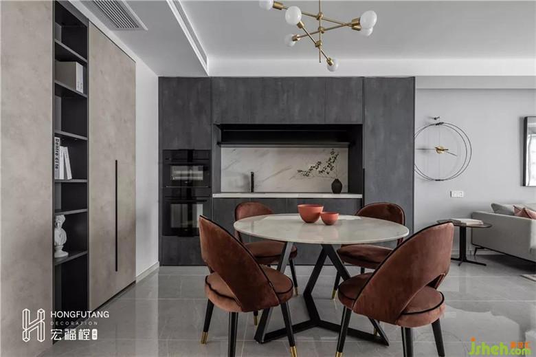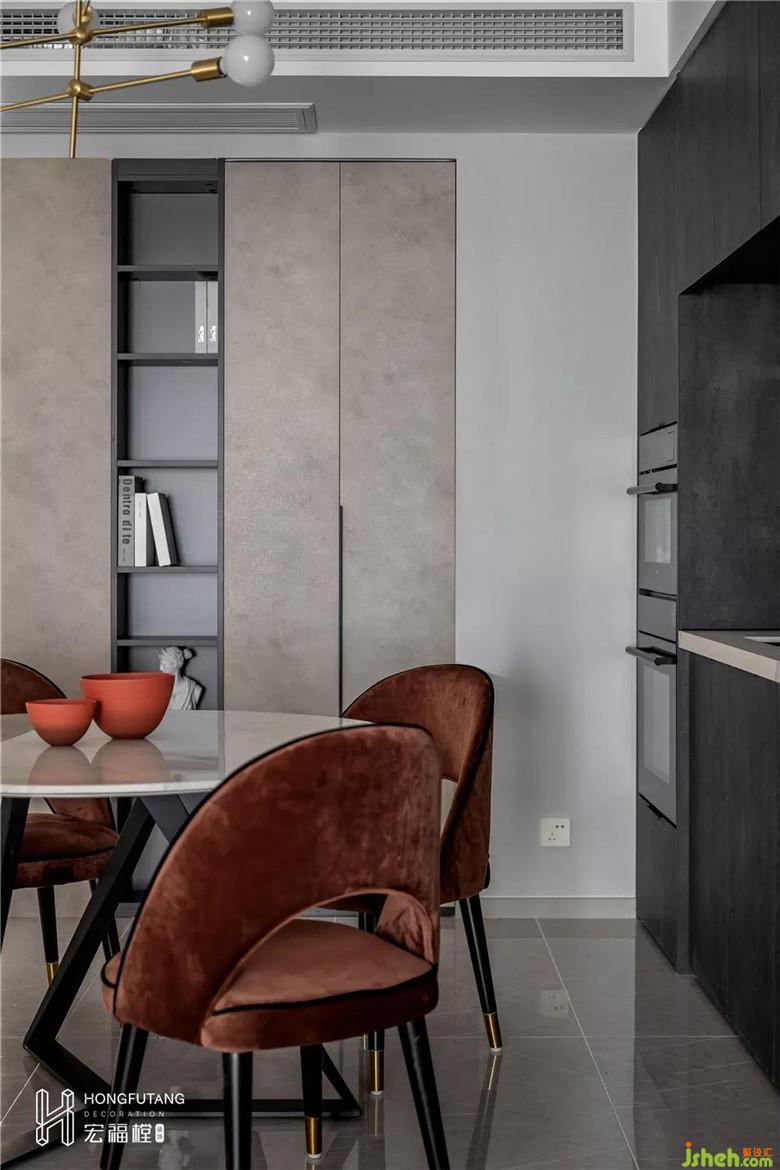 深灰調(diào)巖板肌理的柜門和淺色石材的自然紋理進(jìn)行對(duì)比融合,質(zhì)感展現(xiàn)無(wú)遺,時(shí)尚中彰顯出沉穩(wěn)、有力的氣場(chǎng)和格調(diào);挖空的白色輪廓,增強(qiáng)置物性,修飾了結(jié)構(gòu)的色調(diào),在暗色中成為了視覺(jué)的焦點(diǎn),將餐廳區(qū)域也作為生活美學(xué)的展示區(qū)。