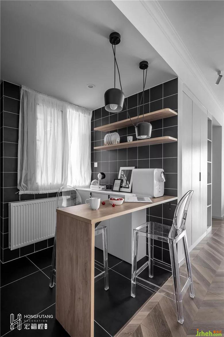 考慮到原廚房空間擁擠封閉,沒有采光和通風(fēng),所以將生活陽臺與之合并,并隔出一個設(shè)備區(qū)放置天然氣表與熱水器。