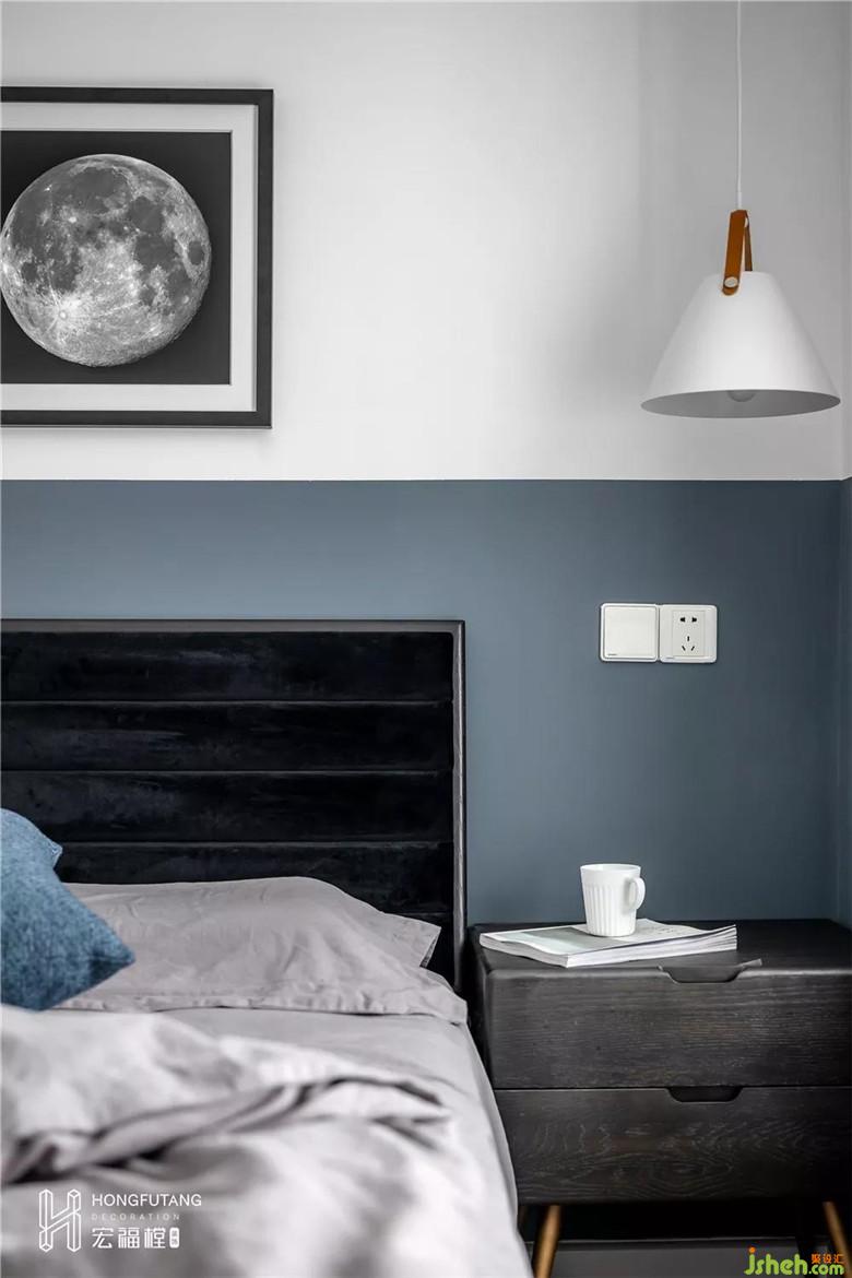 主臥以融入的藍(lán)色調(diào)來純粹靜謐的睡眠氣氛,棉麻質(zhì)地的生活用品與木質(zhì)床頭柜的融合巧妙的讓空間回歸自然本身。