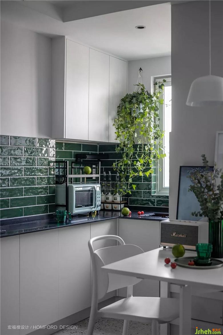 容易接觸到油漬的地方采用墨綠色磁磚鋪貼,非常利于有一點(diǎn)懶懶性格的她偶爾的簡單打掃。